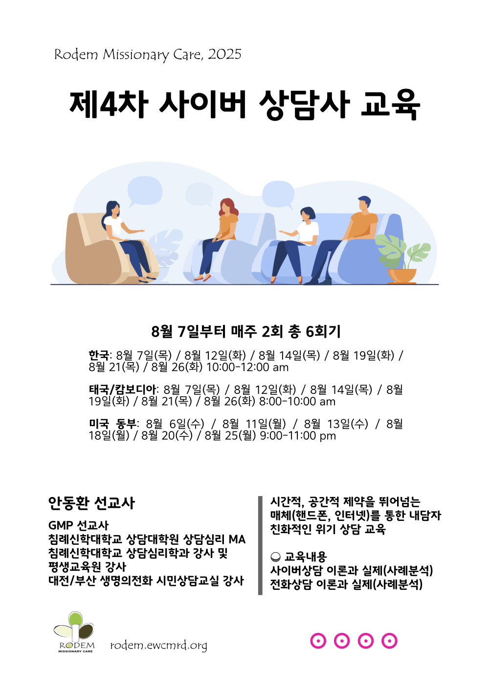 Rodem Counseling Academy 치앙마이에 본부를 둔 로뎀선교사상담소에서 상담에 관심 있는 선교사들을 위한 “로뎀 상담 아카데미(Rodem Counseling Academy, RCA)”를 열게 되었습니다. 자신과 타인을 이해하고 […]